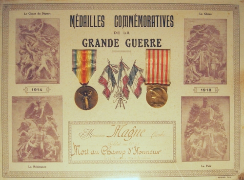 La famille conservera dans un cadre un diplôme et deux médailles commémoratives : à gauche la médaille interalliée, dite médaille de la victoire, et à droite la médaille commémorative 1914-1918 dite médaille des Poilus, créée en 1920 et attribuée à tous les militaires sous les drapeaux entre le 2/08/1914 et le 11/11/1918.